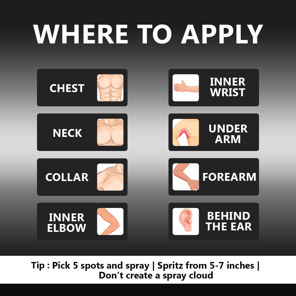 Spray evenly on pulse points such as wrists, neck, and behind the ears.