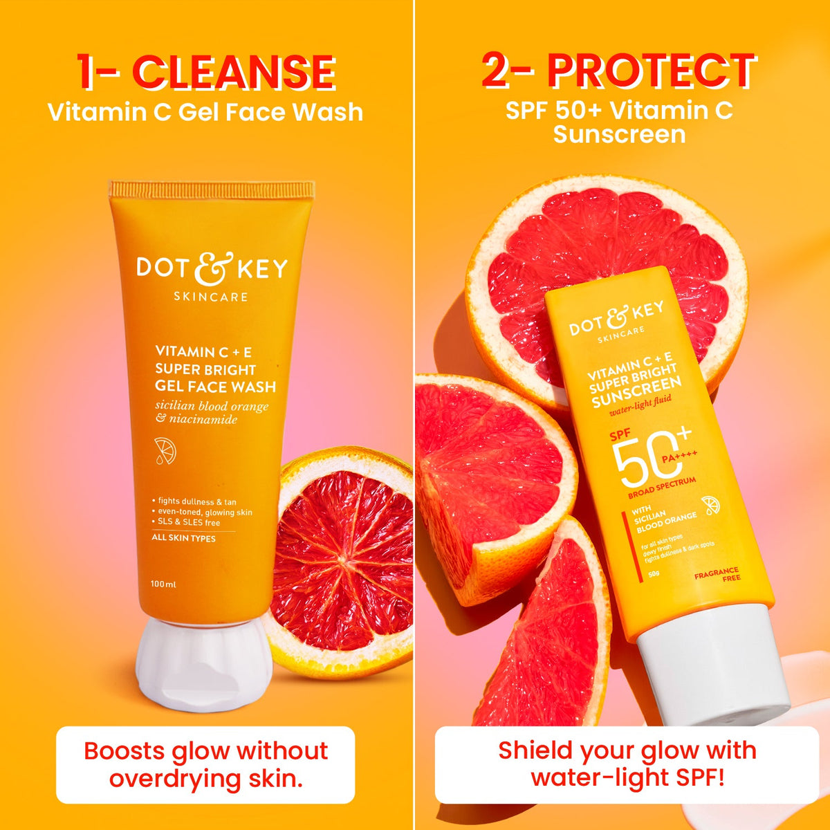 Vitamin C Sunscreen:Water, Ethyl Ascorbic Acid, Niacinamide, Glycerine, Ethoxydiglycol, Propanediol, 1,3-Butylene Glycol, Ethylhexylglycerin (and) Phenoxyethanol, Tocopheryl Acetate, Ferulic Acid, Citric Acid, Xanthan gum, Hydroxyethyl Cellulose, Disodium EDTA, Sodium Gluconate, Allantoin, Sodium Hyaluronate, Alpha Arbutin, Laminaria Digitata Extract (and) Cetyl-PG Hydroxyethyl Palmitamide (and) Ceramide mix, Citrus Aurantium Dulcis (Blood Orange) Fruit Extract, Terminalia Ferdinandiana (Kakadu Plum) Fruit Extract, Cucurbita Pepo (Pumpkin) Fruit ExtractVitamin C Gel Face Wash:Aqua, Cocamidopropyl Betaine, Decyl Glucoside, Glycerine, Disodium Cocoyl Glutamate, Triethanolamine, Terminalia Ferdinandiana (Kakadu Plum) Fruit Extract, Citrus Aurantium Dulcis (Blood Orange) Fruit Extract, Niacinamide, Benzyl Alcohol (and) Ethylhexylglycerin (and) Tocopherol, Acrylates/C10-30 Alkyl Acrylate Crosspolymer, Xanthan Gum, PEG-40 Hydrogenated Castor Oil, Disodium EDTA, Citric Acid, Menthol, Sodium Ascorbyl Phosphate, Mentha Piperita (Peppermint) Oil, D-Panthenol, Tocopheryl Acetate, IFRA Certified Allergen Free Fragrance, CI 15985, CI 19140