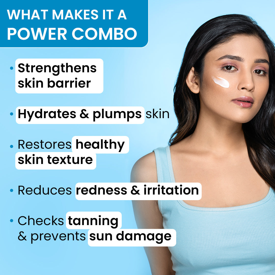 Strengthens skin barrier | Hydrates & plumpsskin | Restoreshealthy skin texture | Reducesredness & irritation | Checkstanning& preventssun damage