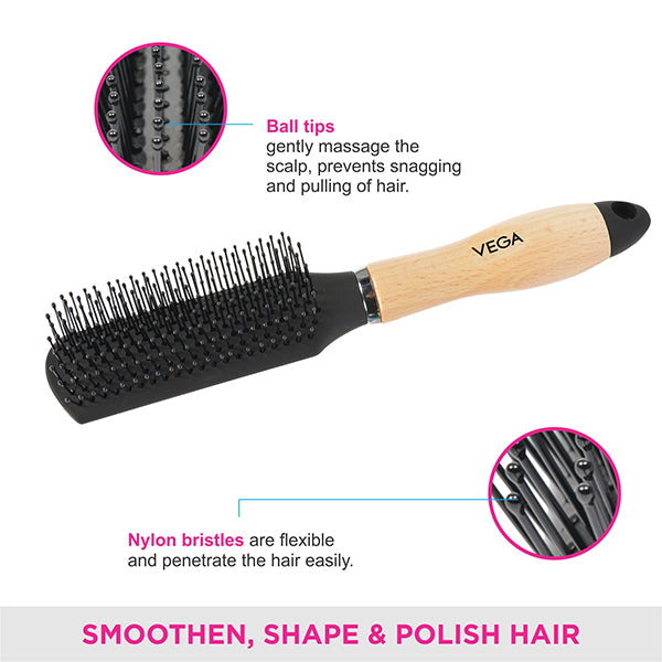 This Vega Flat Hair Brushes are best for the daily styling of hair to impart an even texture and volume.These brushes are designed to provide grip and control to the hair for smoothing, styling, de-tangling and delivering the right finishing touch. It's best suited for short to medium hair length. It's compact and can be used by both men and women for a smooth and quick brushing experience. The stylish wooden handle adds to the aesthetics of the brush.