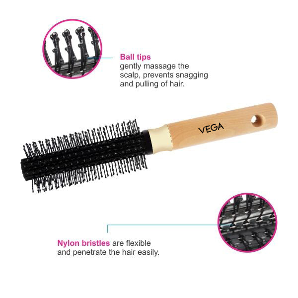 Vega Round Brushes are designed to be used for a quick curl and at the same time add volume and smoothen hair shaft. The nylon bristles penetrate the hair and detangles hair smoothly. This hair brush is ideal for daily use, detangling and smoothening hair. The ball-tipped bristles ensure gentle massage and instant root lift. Comes in a wooden body with a comfortable grip.