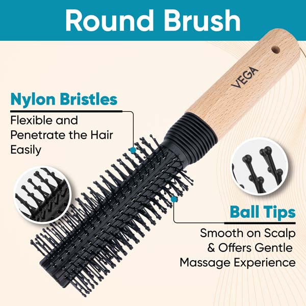 Vega Round Brushes are designed to be used for a quick curl and at the same time add volume and smoothen hair shaft. The nylon bristles penetrate the hair and detangles hair smoothly. This hair brush is ideal for daily use, detangling and smoothening hair. The ball-tipped bristles ensure gentle massage and instant root lift. Comes in a classic black & natural color with a proper grip.