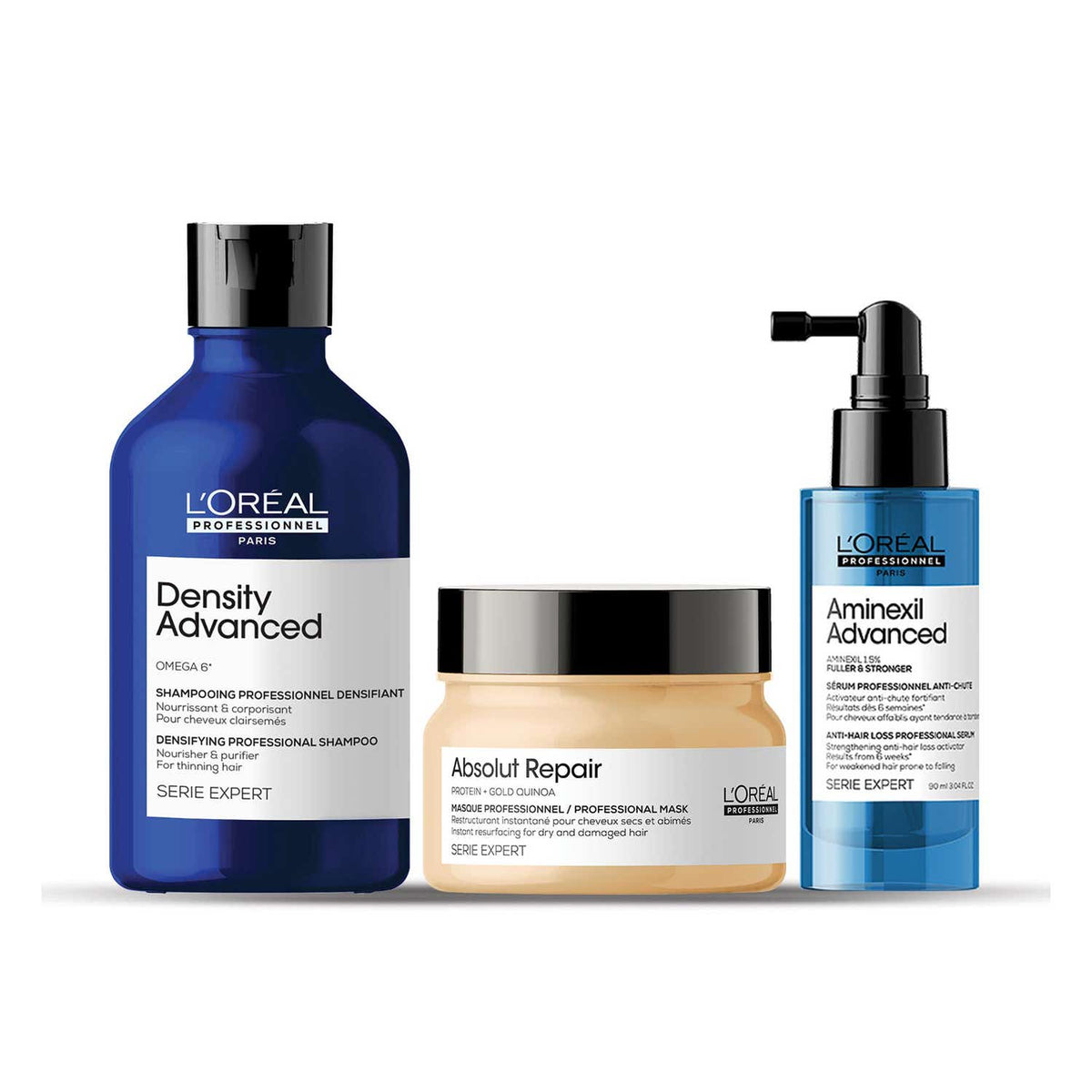 L'Oreal Professionnel Density Advanced Shampoo, Absolut Repair Hair Mask and Aminexil Advanced Serum Combo