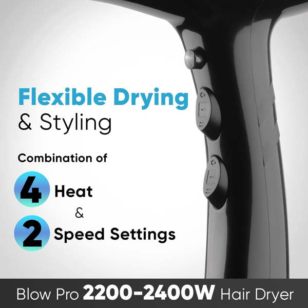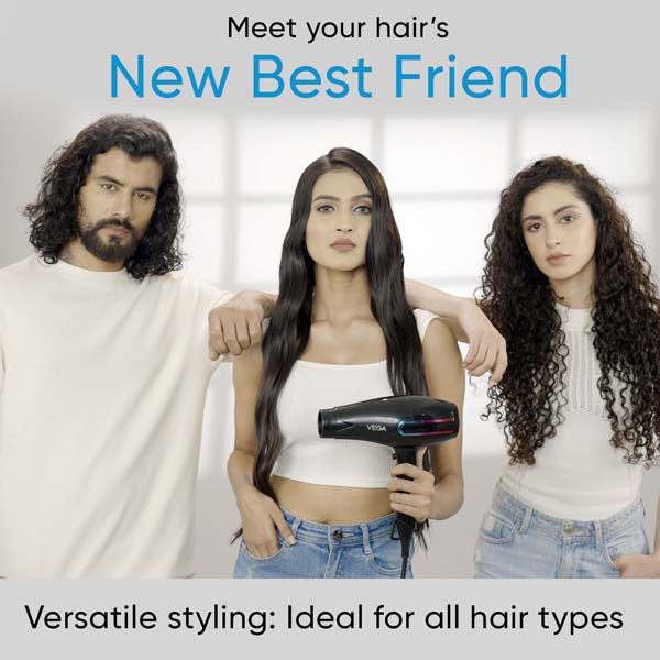 Vega Blow Pro 2200-2400W Hair Dryer is an advanced high-performance professional hair dryer equipped with powerful 2200-2400W motor. It is designed to be your perfect hair styling partner for both drying and styling hair as it features 3 attachments 1 Nozzle for concentrated drying, 1 Comb Nozzle for effortless detangling hair while drying and 1 Diffuser to enhance the natural texture of your curly hair. With its combination of 4 Heat and 2 Speed Settings, you get the versatility to dry and style hair of all types and lengths with utmost ease, while the Cool Shot Button allows you to set your hair style. The hair dryer is also equipped with Thermal Cut-off feature to ensure safety of the appliance from over-heating during long use. Additional feature includes a 2.8M long cable for hassle-free hair drying and styling