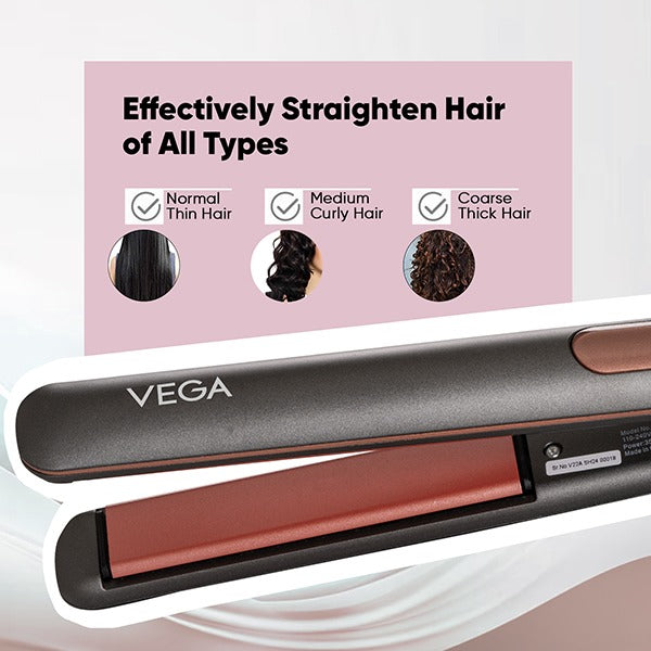 Shine with confidence using the Vega Glam-Shine Hair Straightener featuring Ceramic Coated Plates that evenly distribute heat to deliver silky, smooth results. The floating plates allow the straightener to glide down smoothly with minimum hair snagging and pulling. The Easy Lock System ensures safe storage when not in use and when travelling and the Power Indicator Light offers convenience of use. Additional features include Quick Heat Up for effective results and 360° Swivel Cord that provides styling flexibility without wire tangling.