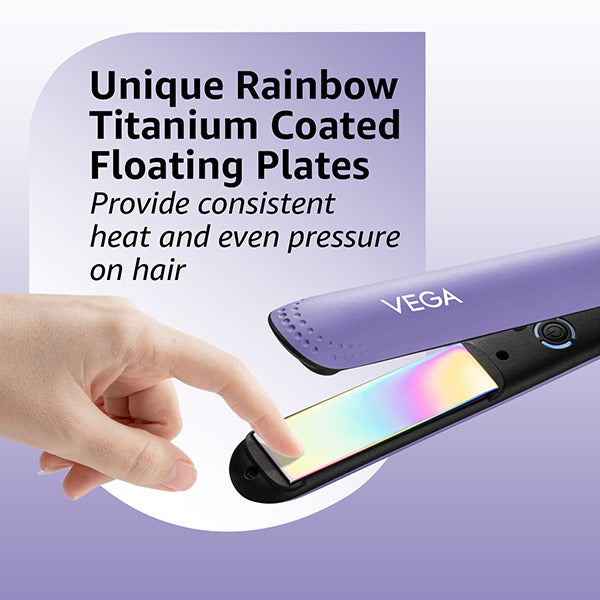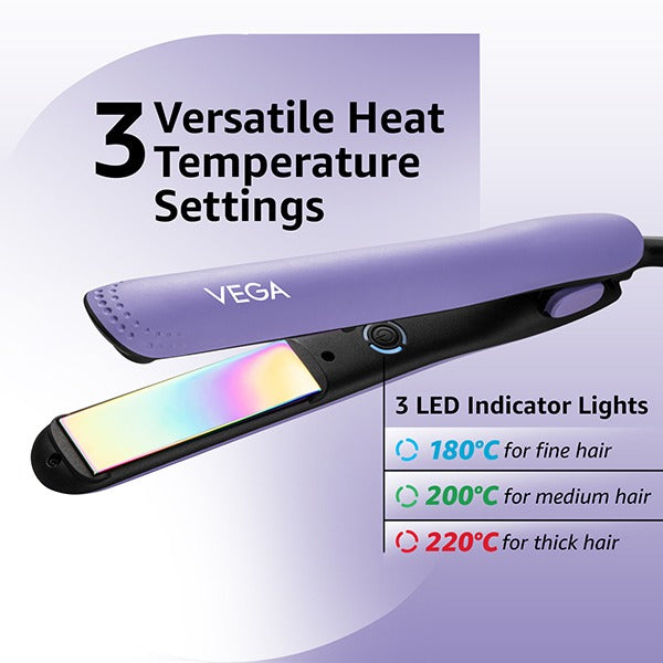 Glam up your everyday look with the Vega Go-Glam Hair Straightener, designed with Rainbow Titanium Plates that glide smoothly through the hair to deliver sleek, shiny and frizz-free results. The Titanium Plates ensure uniform heat distribution while maintaining consistent temperature throughout the styling process, allowing efficient results with minimal passes. The Floating Plates prevent the chances of hair tugging and pulling during each glide. With 3 Temperature Settings (180°C, 200°C and 220°C) indicated through Blue, Green and Red LED Lights, you can easily choose the ideal heat level based on your hair type and hairstyling needs. The Easy Lock System provides safe storage while the 360° Swivel Cord ensures flexibility and prevents wire tangling during use, making the styling process smooth and hassle-free.