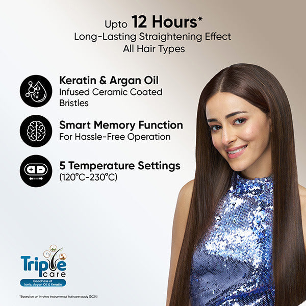 Introducing the Vega L1 Hair Straightener Brush with Smart Memory Function, your ultimate styling partner for sleek shiny hair in minutes. This brush features Ionic Technology, wide paddle design, and dense bristles for faster and long-lasting shiny results. With the Smart Memory Function, the hair straightening brush remembers your last temperature setting, saving you time. Our advanced Triple Care Technology combines ionic technology, keratin, and argan oil-infused ceramic-coated bristles for stunning shine and optimal hair care. Choose from 5 adjustable heat settings (120°C to 230°C) to achieve naturally straight and silky-smooth hair for any texture. Say goodbye to frizz with Anti-frizz Technology, protect your scalp with Anti-scald and Thermo-Protect Technology. Enjoy quick heat-up, effortless styling with the 360° swivel cord, and safely store it in the included travel pouch.