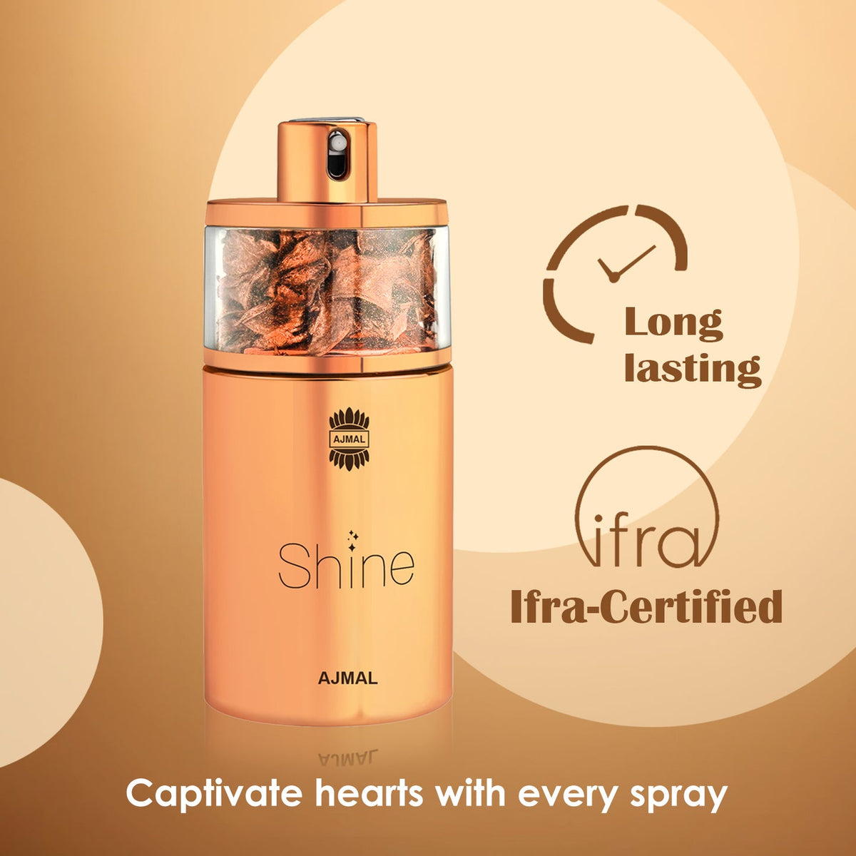 Ajmal Shine Eau De Parfum is a radiant, feminine fragrance that embodies grace and elegance. It opens with fruity and floral notes, followed by a heart of jasmine and rose, and finishes with soft musk and cedarwood. A perfect everyday scent for the confident woman who shines from within.