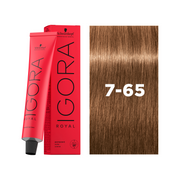 Schwarzkopf Professional Igora ROYAL 7-65 Medium Blonde Chocolate Gold permanent colour creme with up to 70% white hair coverage. The creme can be used for all colour techniques. It provides a chocolate gold tone direction. The Schwarzkopf Professional Igora ROYAL High Definition-Technology features a high definition colour pigment matrix for clearest tone direction, enhanced true-to-taft results, amplified intensity and maximum coverage.