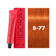 Schwarzkopf Professional Igora ROYAL 8-77 Light Blonde Copper Extra permanent colour creme with up to 70% white hair coverage. The creme can be used for all colour techniques. It provides a copper tone direction. The Schwarzkopf Professional Igora ROYAL High Definition-Technology features a high definition colour pigment matrix for clearest tone direction, enhanced true-to-taft results, amplified intensity and maximum coverage.