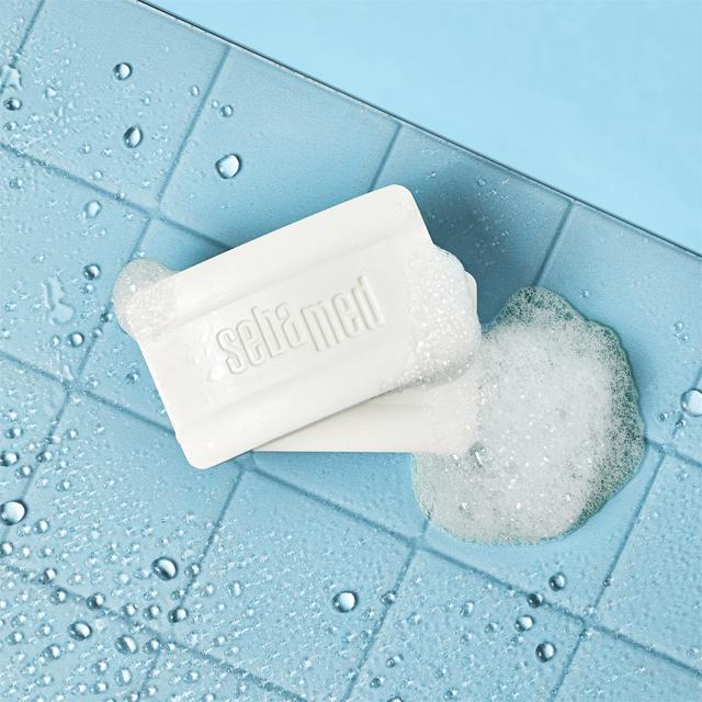 Rub Sebamed Clear Face Cleansing Bar between wet hands to create a gentle lather.