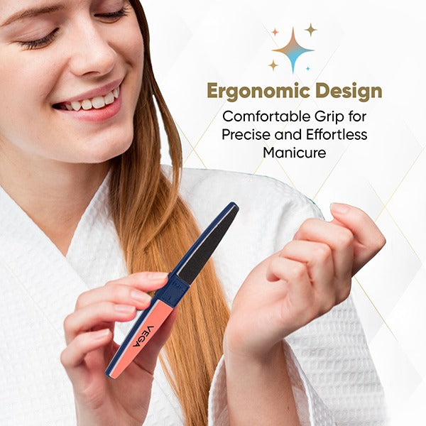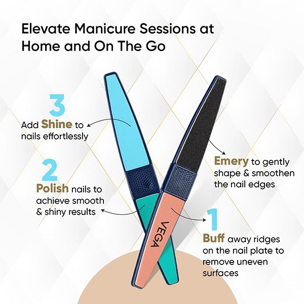 Vega 4 way buffer shapes, buffs and gives shine to natural nails in four easy steps.