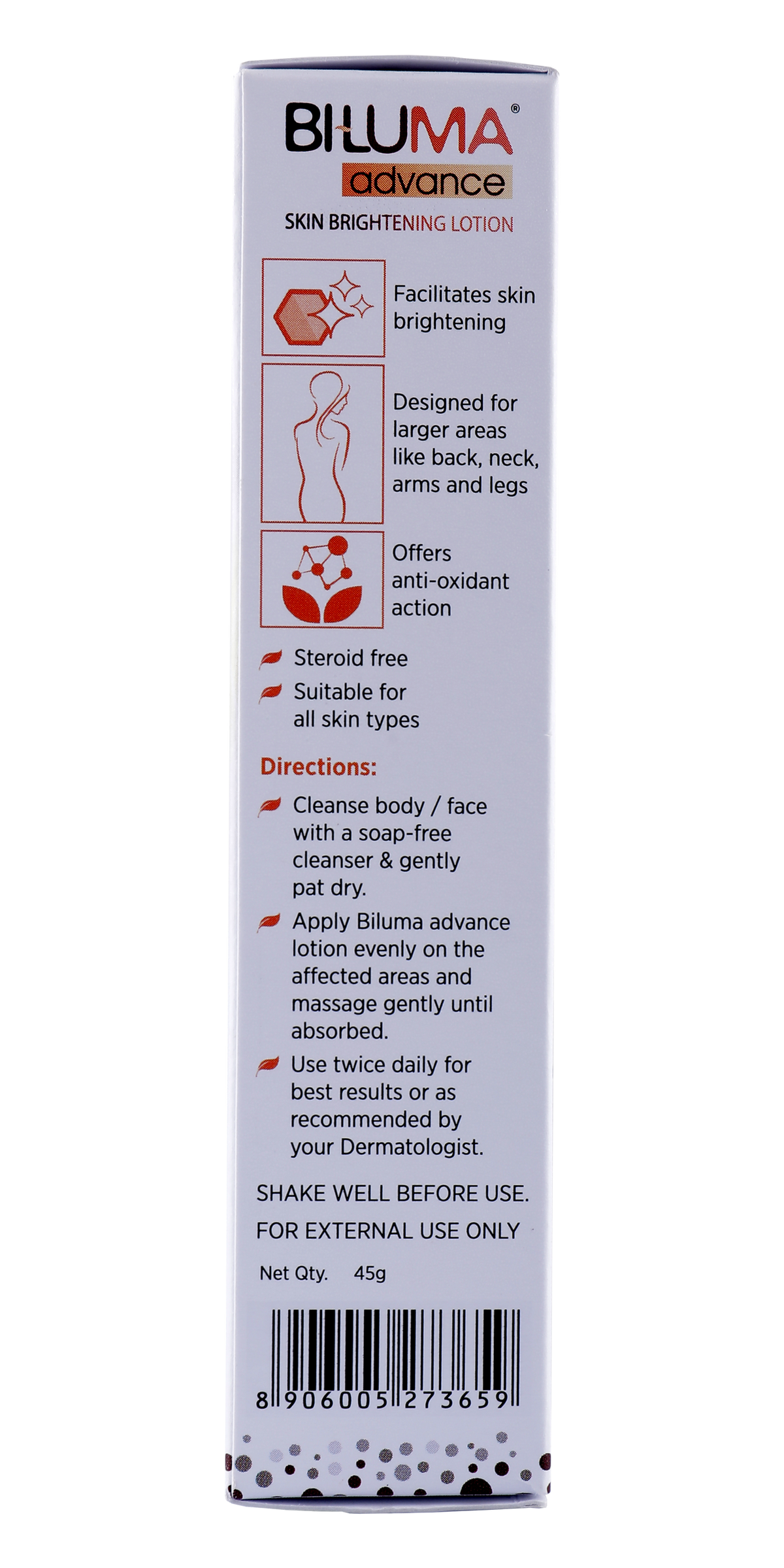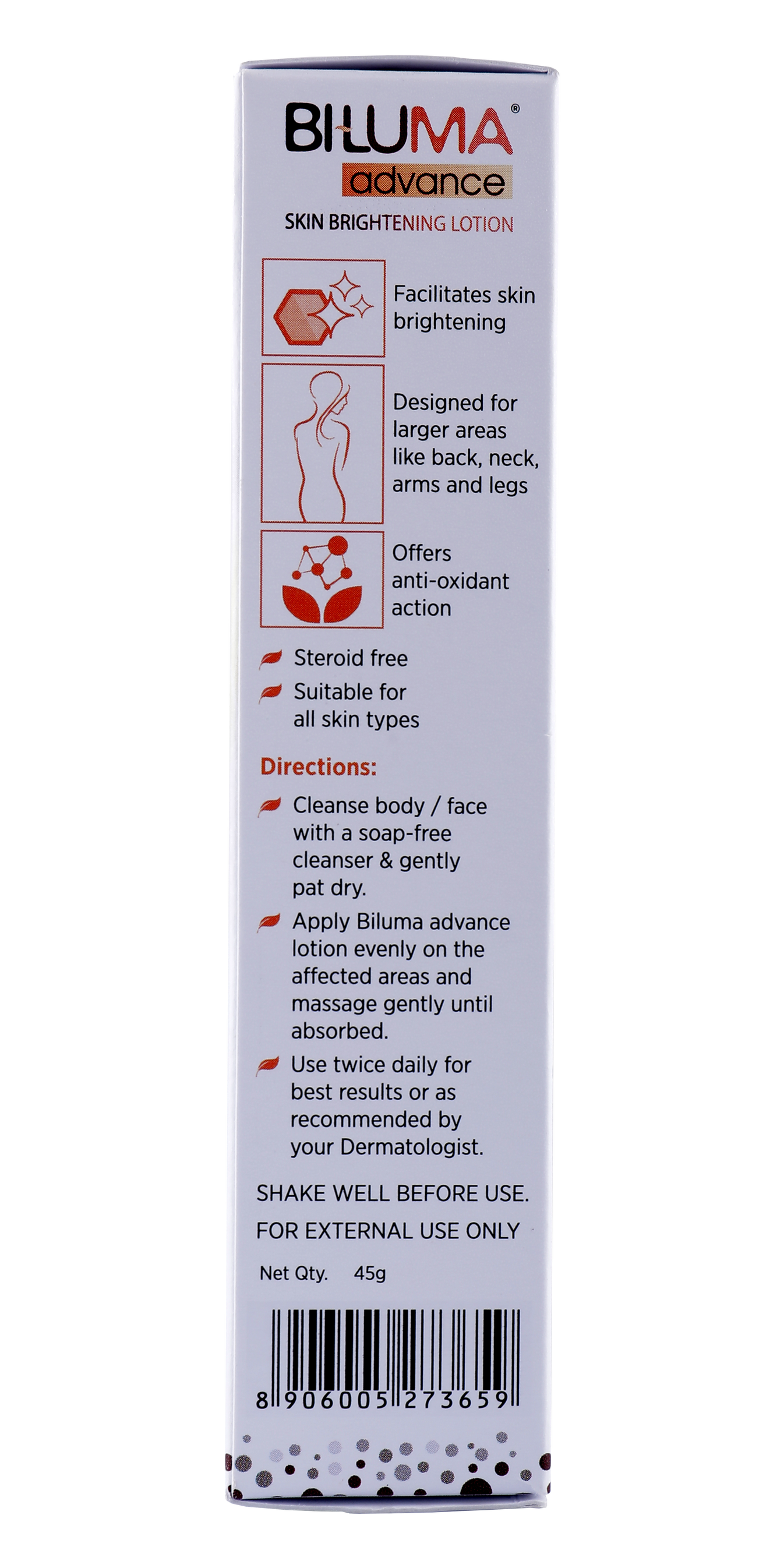 After cleansing and patting body skin dry, apply a generous amount of Biluma Advance Skin Brightening Lotion to arms, legs, back or neck. Massage gently until fully absorbed. Use twice daily (morning and evening) for best results.