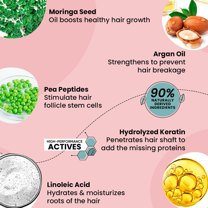 Moringa Seed Oil: Boosts natural keratin production, locks in moisture & strengthens limp, lifeless hair. Hydrolyzed Keratin: Helpsstrengthen hair shaft & checks breakagecausing hair loss. Argan Oil: Natural source of Vitamin E, itincreases hair elasticity & restores volumeto dull, lifeless hair. Pea Peptide: A rich source of amino acid, itstimulates & strengthens hair folliclecells to resist hair loss.