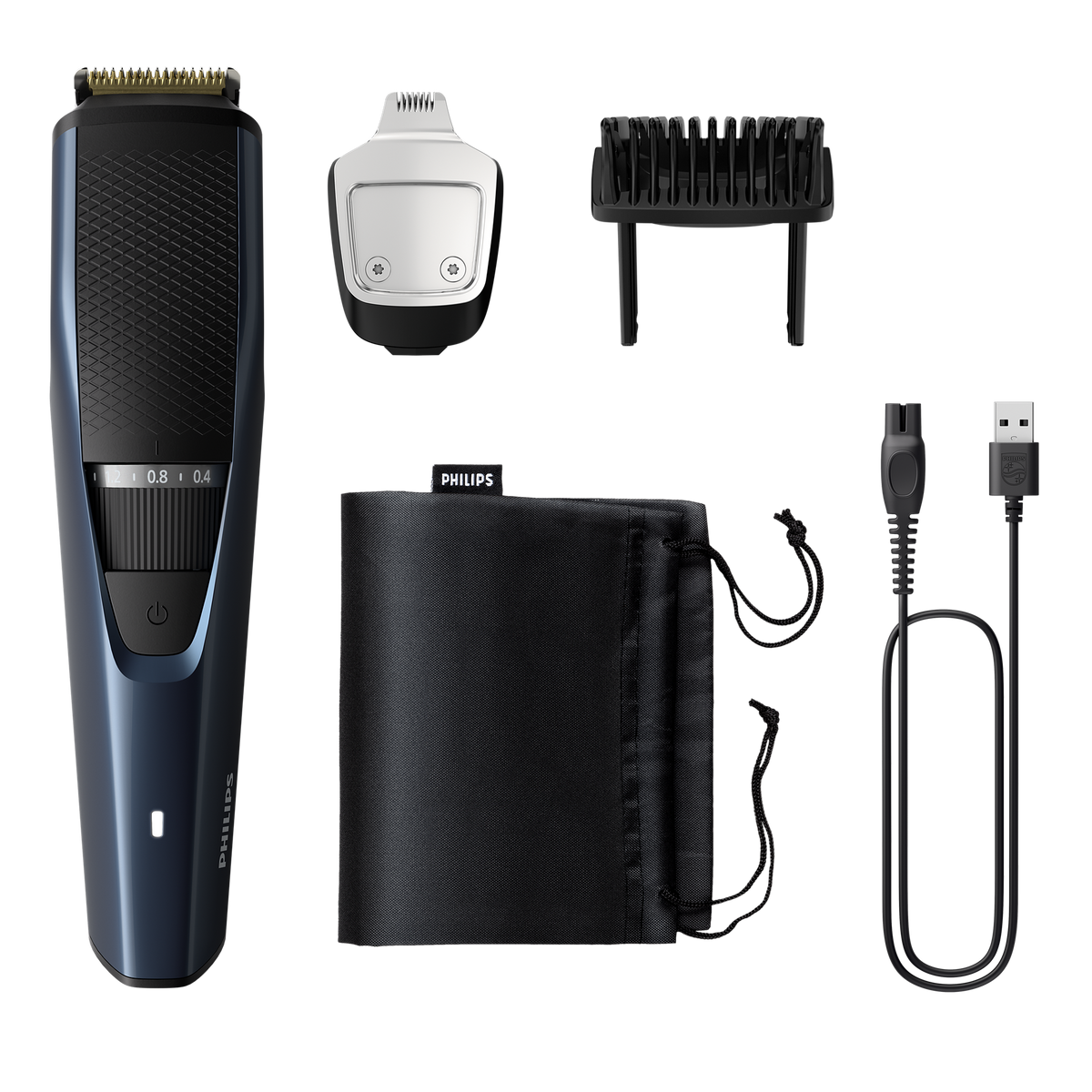 This beard trimmer comes with a USB cable for more flexible charging. The adaptor is not included (recommended adaptor Philips HQ87).