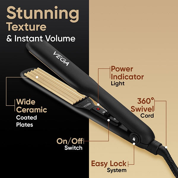 Vega Classic Hair Crimper will amp up your glam quotient in just a few minutes! How, you ask? This hair crimper by Vega gives instant volume and well-defined texture to your hair that you can flaunt all day long. The hair crimper offers even heat distribution with its wide Ceramic Coated Plates featuring 5 Ridges that cover a large section of your hair at one go. The hair crimper is suitable for all types of hair and you can style almost instantly, thanks to its Quick-heat up! Its Easy Lock System helps to close the plates together effortlessly and provides easy and convenient storage. Vega also offers 360° Swivel Cord in its hair crimper to allow easy rotation during usage while preventing unnecessary tangles.